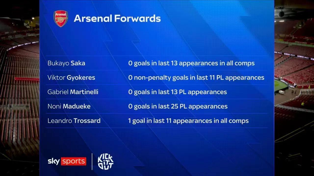 也有媒体认为目前阿森纳的问题在于锋线的迷失,据天空体育报道,目前阿森纳的锋线球员大部分都陷入了进球荒。其中,球队当家得分手萨卡,已经各项赛事13场比赛0进球了,约克雷斯目前是11场非点球0进球,马丁内利是近13场英超0进球,马杜埃凯凯更是多达25场英超联赛0进球,特罗萨德目前也仅仅只是各项赛事近11场比赛打入1球。可以说,最近的阿森纳几乎全靠后卫进球在续命,这也不得不让大家担心,未来的阿森纳是否能够继续赢下去。